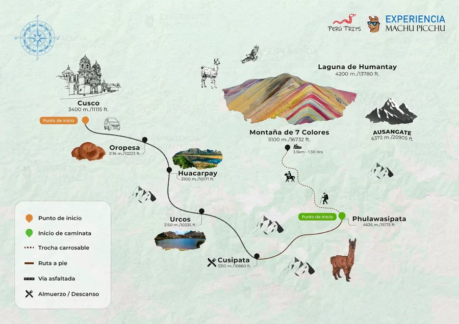 - Iniciaremos la caminata a través de un sendero inicialmente fácil, la caminata durará 1 hora y 30 minutos aproximadamente hasta llegar a la Montaña de 7 Colores “Vinicunca” ubicada cerca de los 5020 m.s.n.m. aprox.